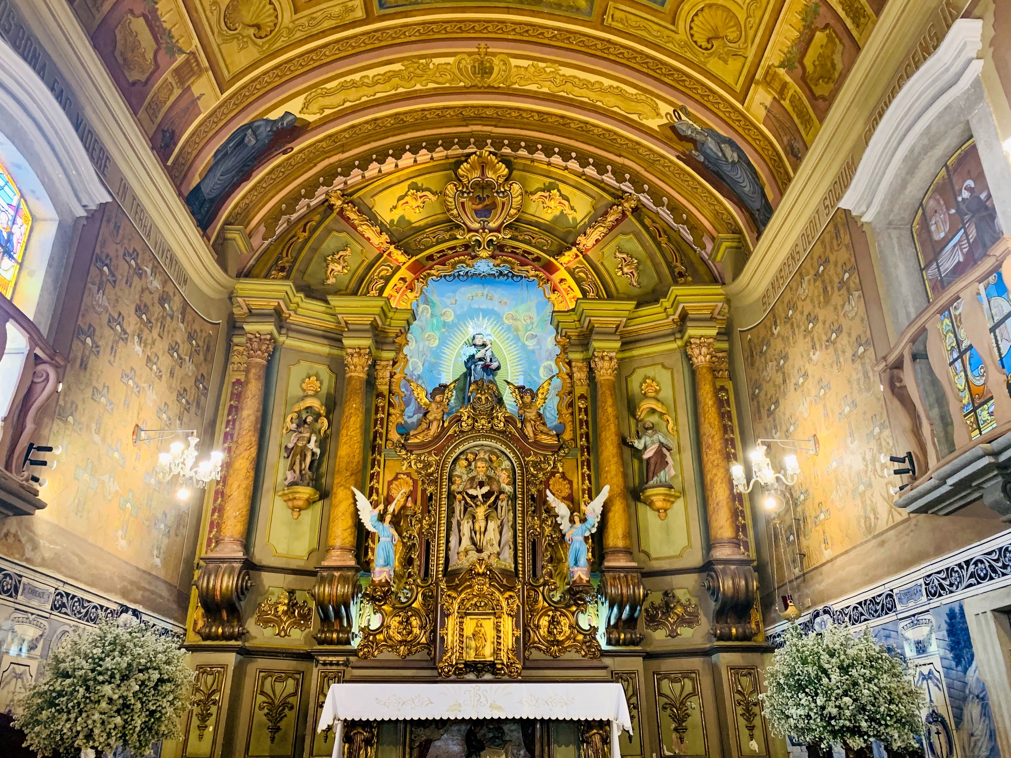 Um dos pontos mais curiosos é o trono rotativo no altar-mór: de um lado exibe a imagem da Santíssima Trindade, e do outro o ostensório da Adoração Perpétua.