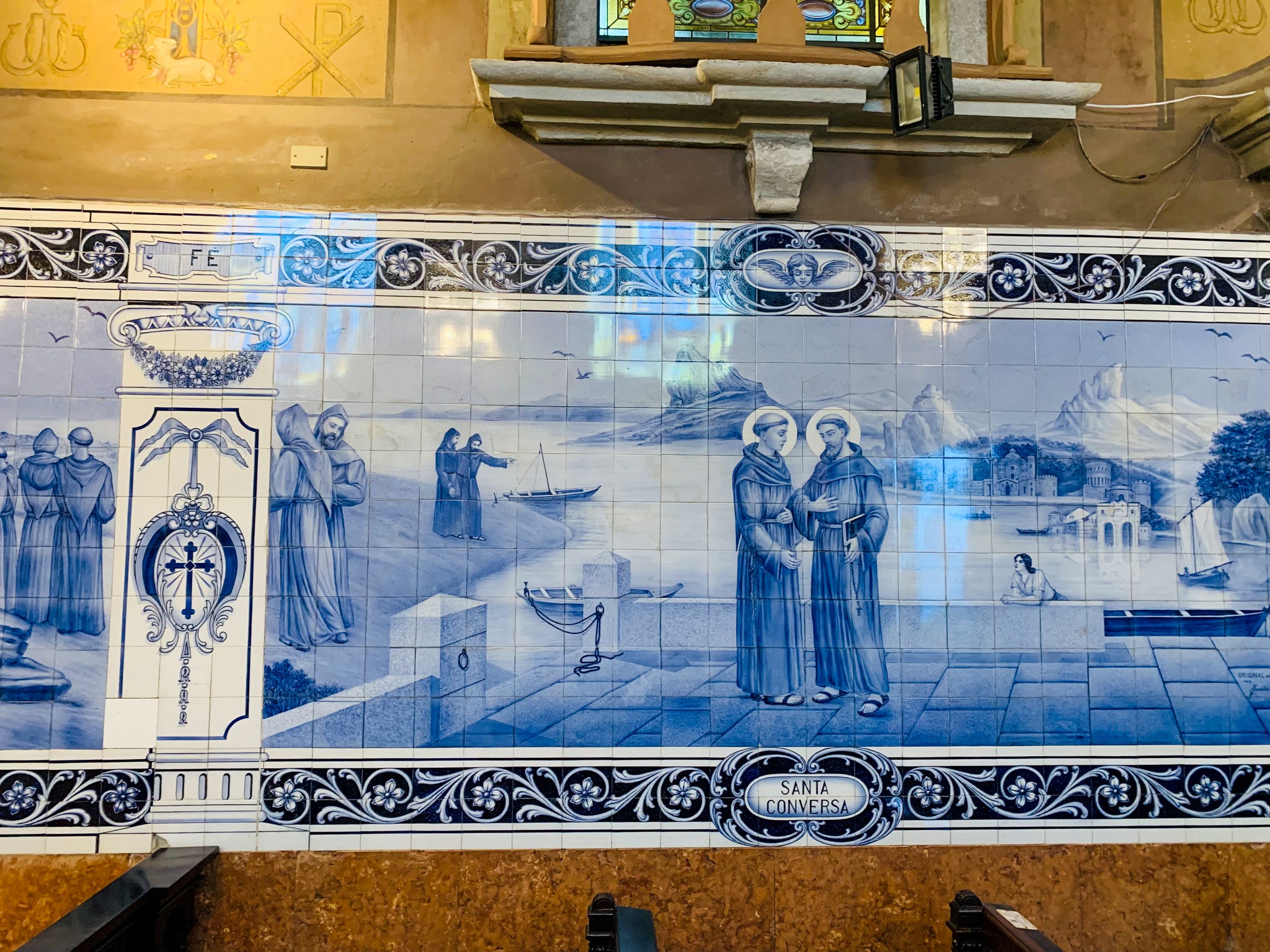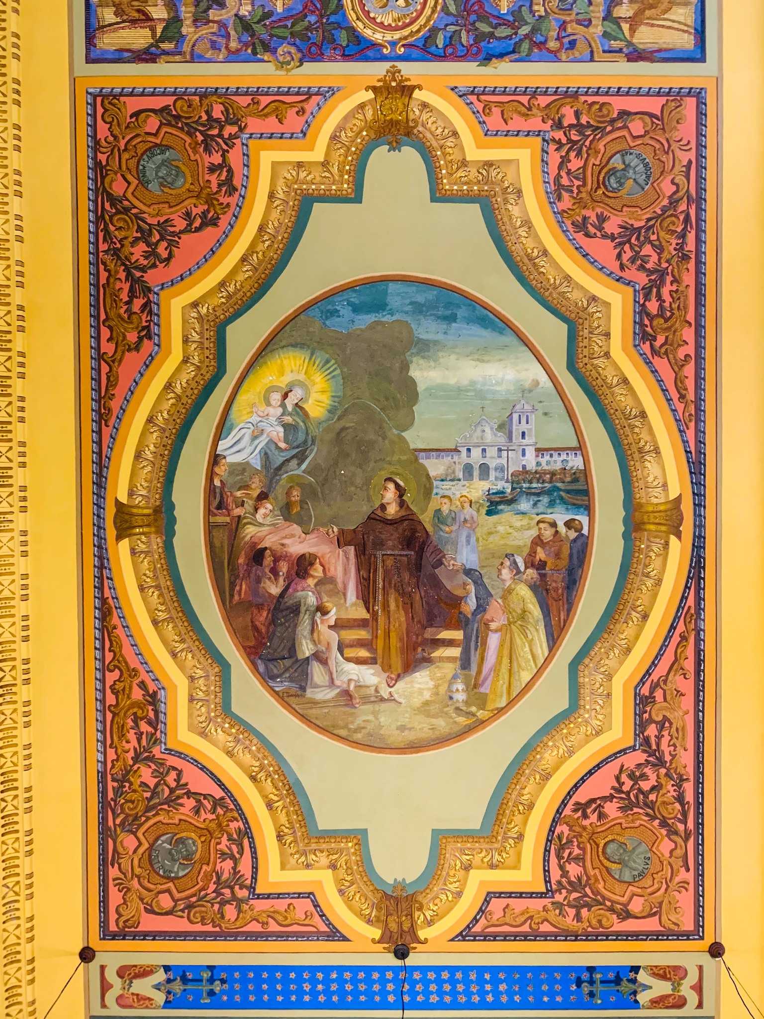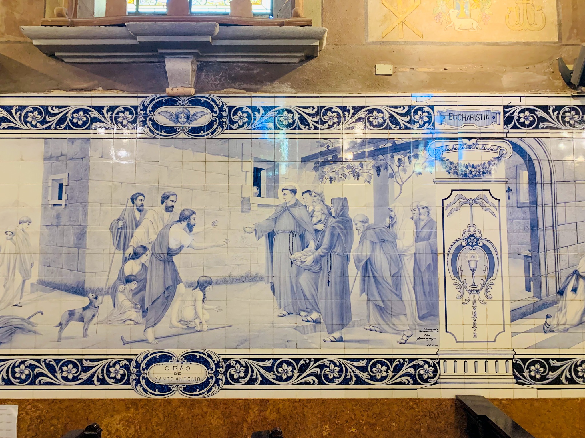Entre os murais estão cenas da vida de Santo Antônio, e o artista fez um auto-retrato num dos painéis (vestido de paletó e gravata).