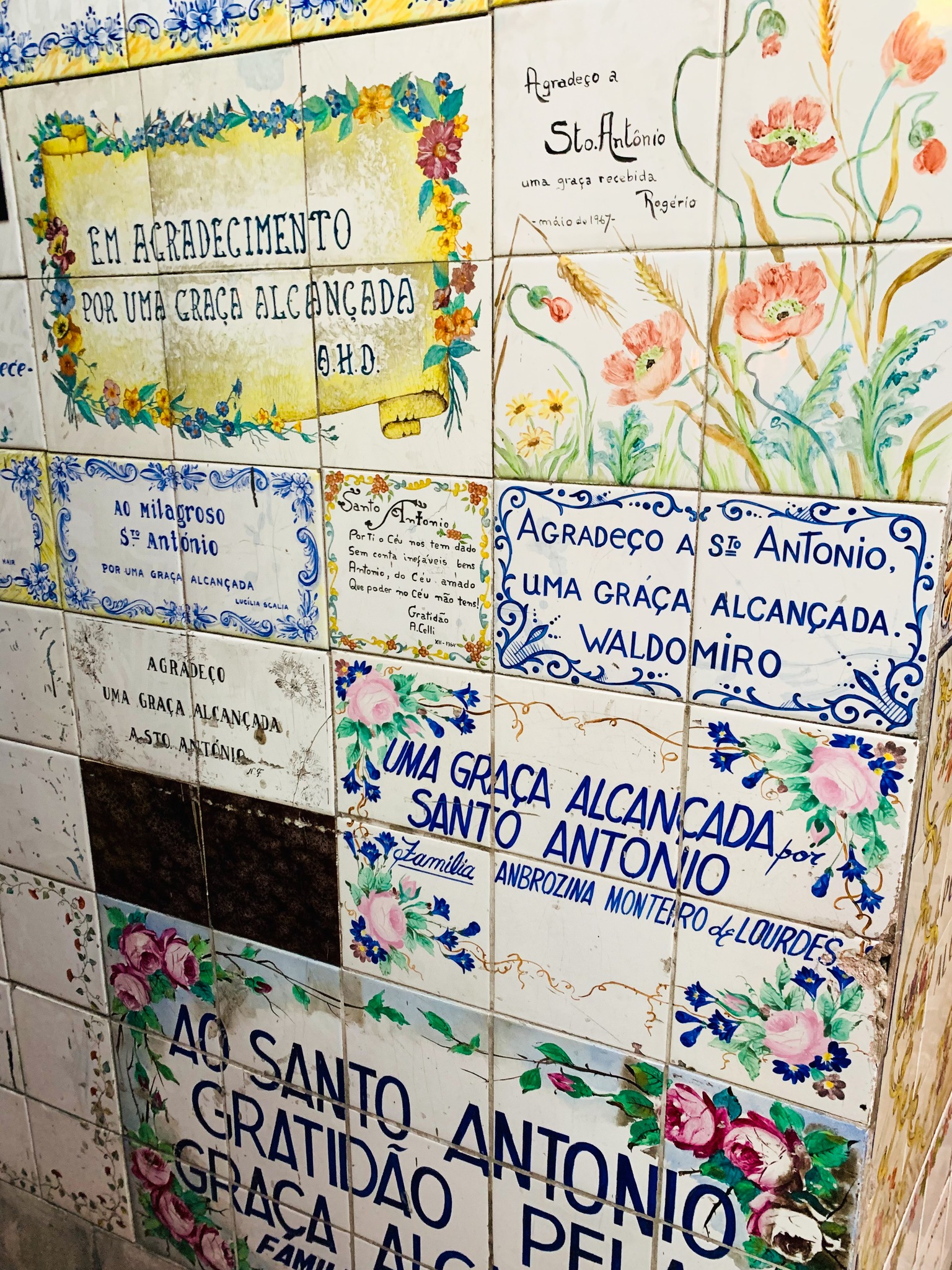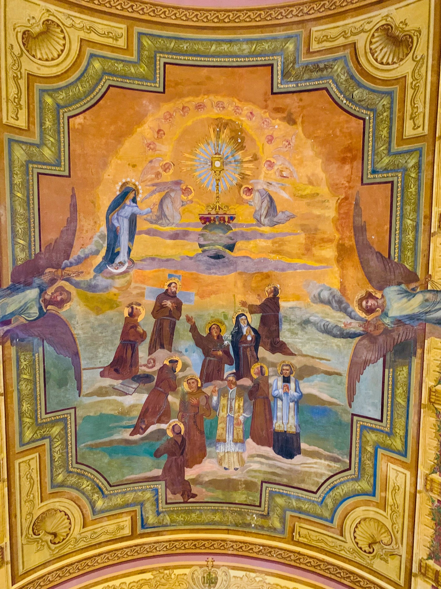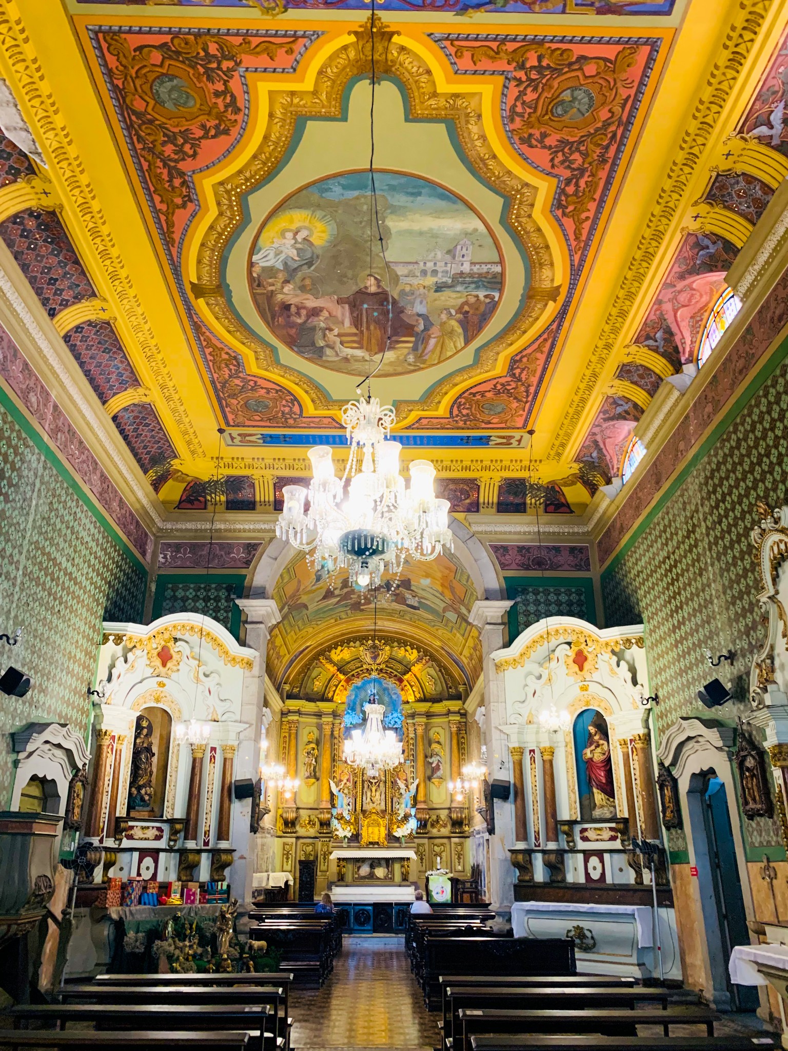 Entre os murais estão cenas da vida de Santo Antônio, e o artista fez um auto-retrato num dos painéis (vestido de paletó e gravata).