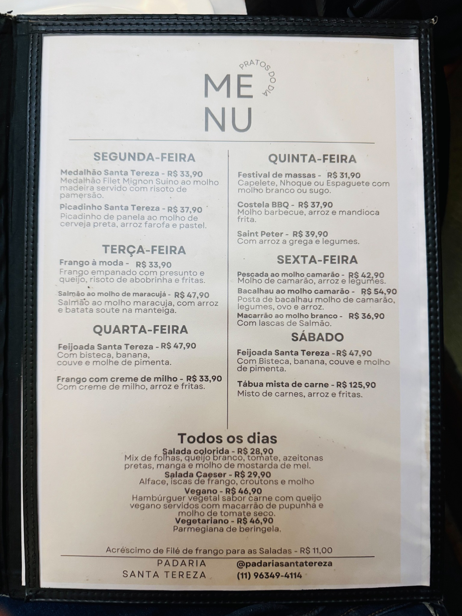 O cardápio da Padaria Santa Tereza é super variado e oferece café da manhã, almoço, café da tarde e jantar. Entre os mais pedidos, estão:
